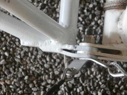 Suite à une rupture de structure (sans conséquence grave) j'ai fait ressouder par un pro et renforcer cette partie de la structure. Je n'ai pas eu le reflexe de photographier cette "fracture". Avec le conseil du président Thillement, propriétaire du Balerit n° 28, nous avons décidé de renforcer cette partie de la stucture. Pour mon appareil (132) il était plus facile de renforcer par une pièce alu soudée parce qu'il y avait eu rupture d'un côté ; ayant démonté l'ensemble de la structure arrière, j'ai fait renforcer les deux côtés de façon identique. Gaston Thillement propose un renfort par étrier et tiges filetées, de cette façon le démontage de l'ensemble n'est pas nécessaire, il l'a réalisé de façon préventive sur son appareil..